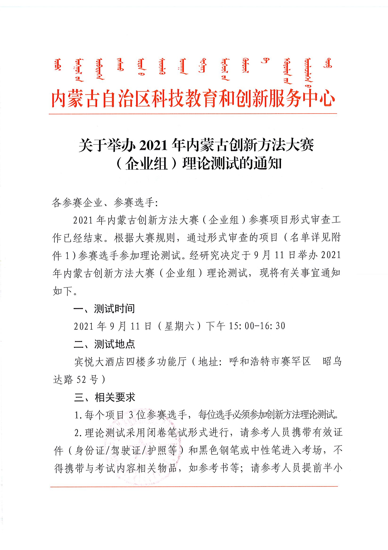 关于举办2021年内蒙古创新方法大赛(企业组)理论测试的通知