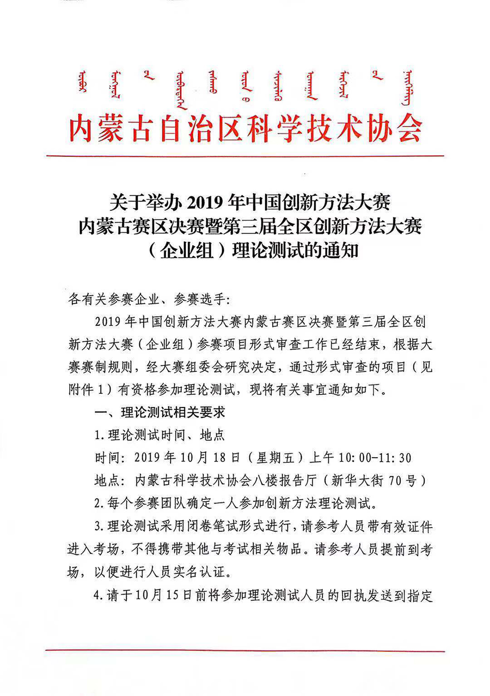 关于举办2019年中国创新方法大赛内蒙古赛区决赛暨第三届全区创新方法大赛(企业组)决赛的通知