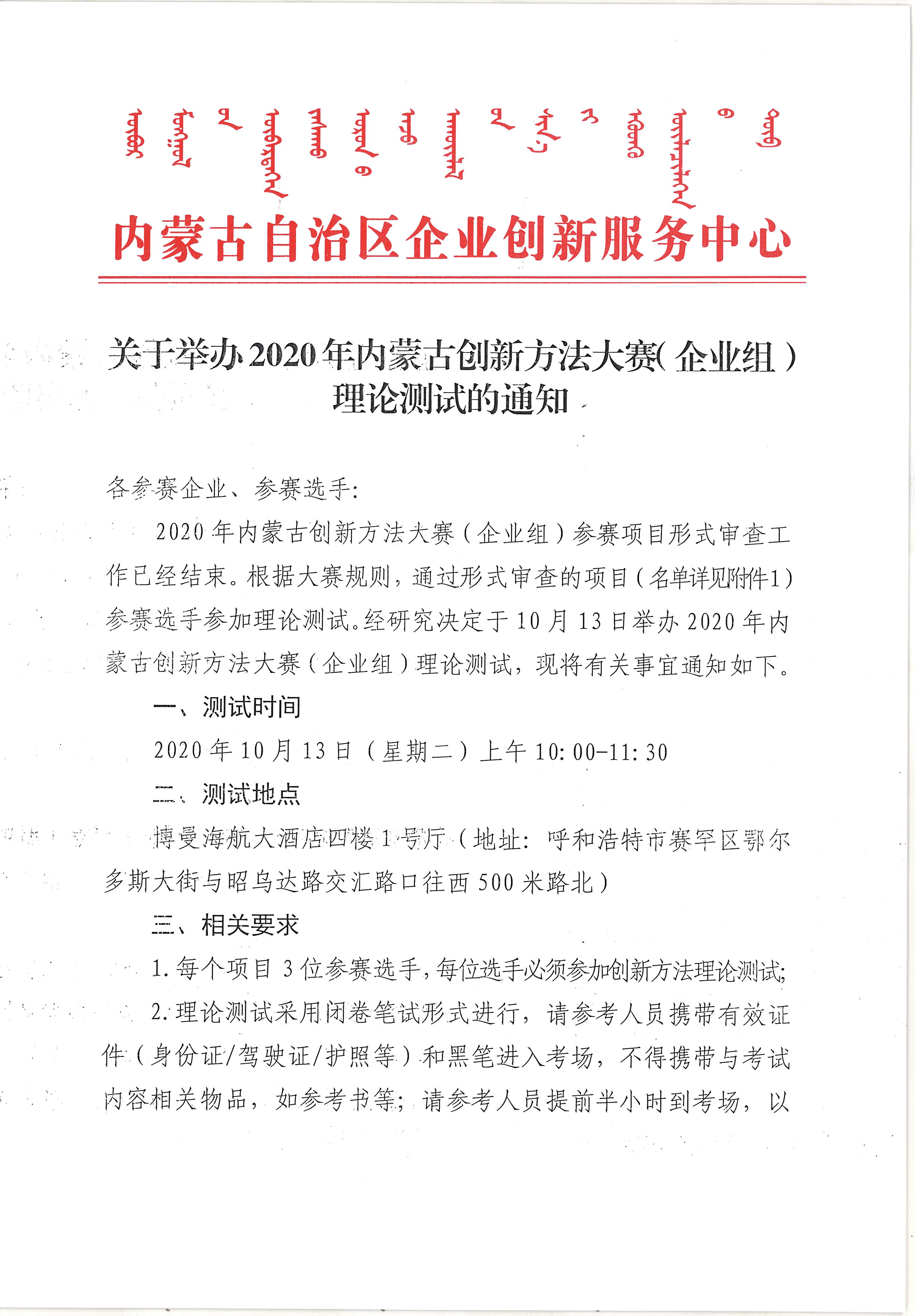 关于举办2020年内蒙古创新方法大赛(企业组)理论测试的通知